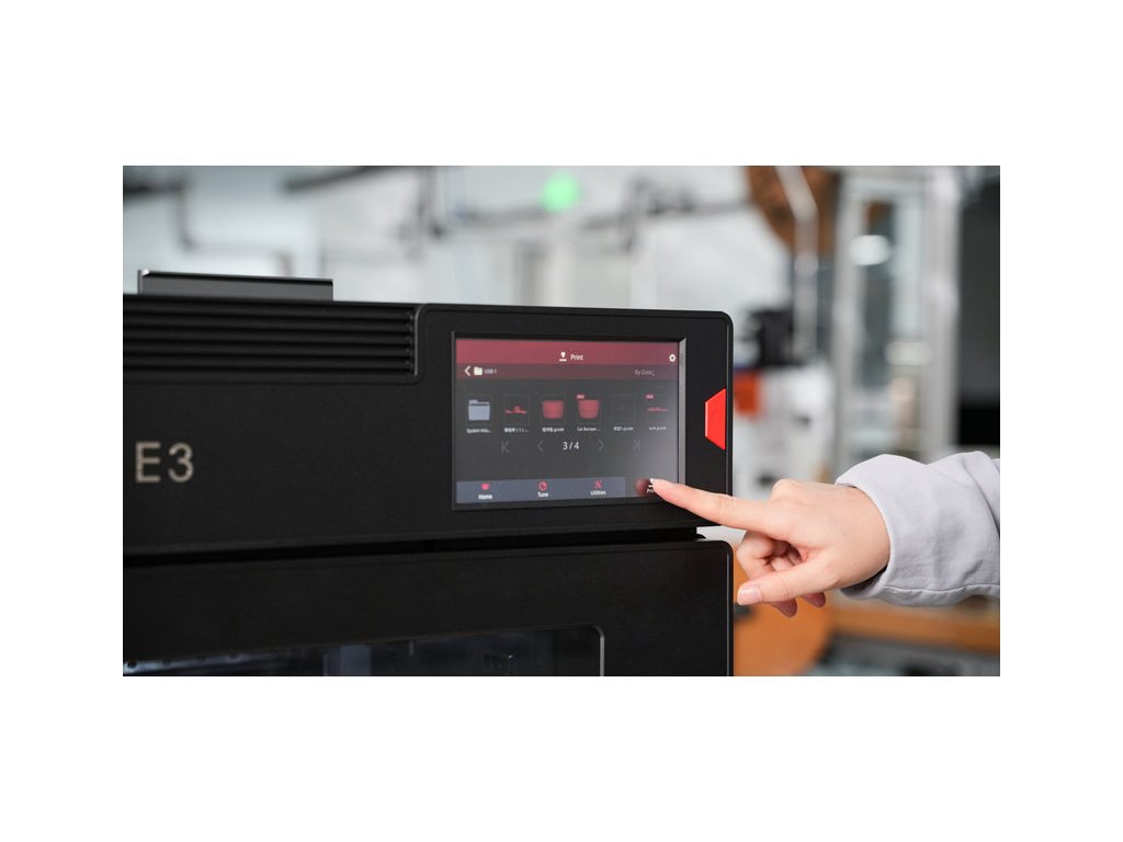 Tiskárna E3 nabízí objem tisku až 330 × 240 × 240 mm a rychlost tisku až 200 mm/s. Funkce jako oboustranný tisk IDEX, automatické vyrovnávání podložky, senzory filamentu a obnova po výpadku napájení zajišťují stabilní produkci.