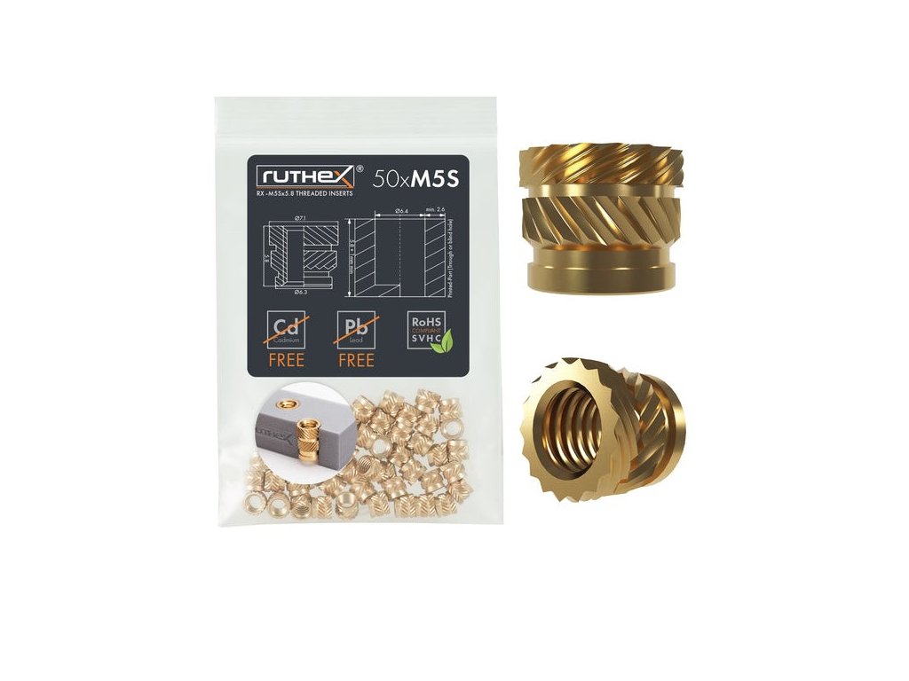 Sadu závitových vložek Ruthex RX-M5Sx5.8 tvoří 50 kusů lisovacích matic s vnitřním závitem M5 a délkou 5,8 mm. Závitové vložky lze vkládat pomocí ultrazvuku a tepelného zapouštění.