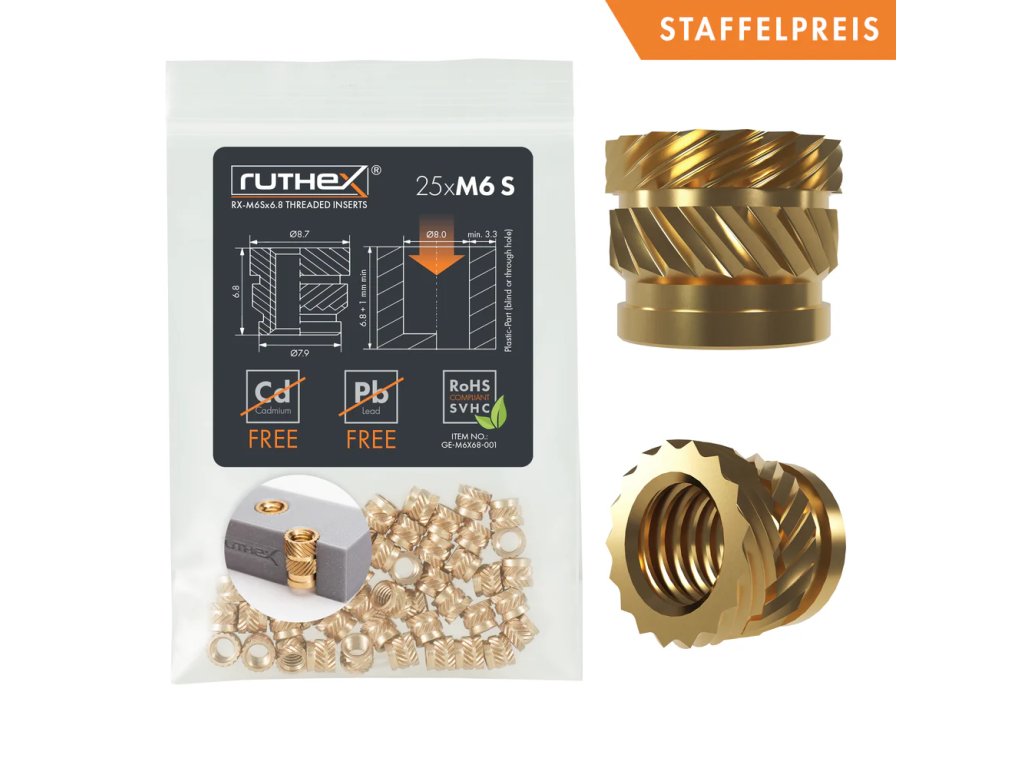 Sadu závitových vložek Ruthex RX-M6x6.8 tvoří 25 kusů lisovacích matic s vnitřním závitem M6 a délkou 6,8 mm. Závitové vložky lze vkládat pomocí ultrazvuku a tepelného zapouštění.
