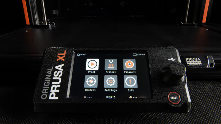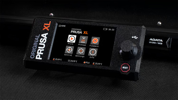 Vyberte si svůj oblíbený způsob ovládání tiskárny XL! Můžete používat buď fyzické otočné tlačítko pro hmatovou odezvu, nebo stále oblíbenější dotykový panel. Barevný LCD displej vám nabízí přehledná menu a jednoduché instrukce, a díky mnoha funkcím, jako jsou náhledy G-code, užitečné QR kódy, funkce Zrušit objekt a mnoho dalších užitečných vylepšení, je ovládání tiskárny XL radost!